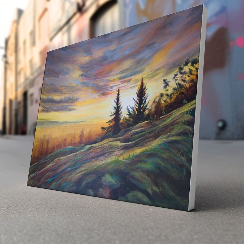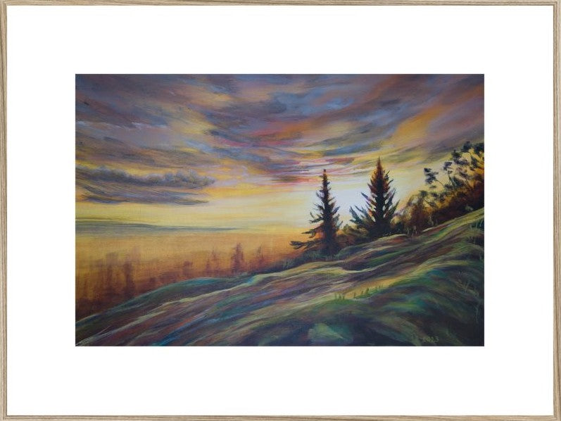 Breathe in the luminous quiet and stillness looking out from the height of this mountain. The distant ocean blends into the sky as the sun lights up the world with gold, colour, and hope as a new day is born.