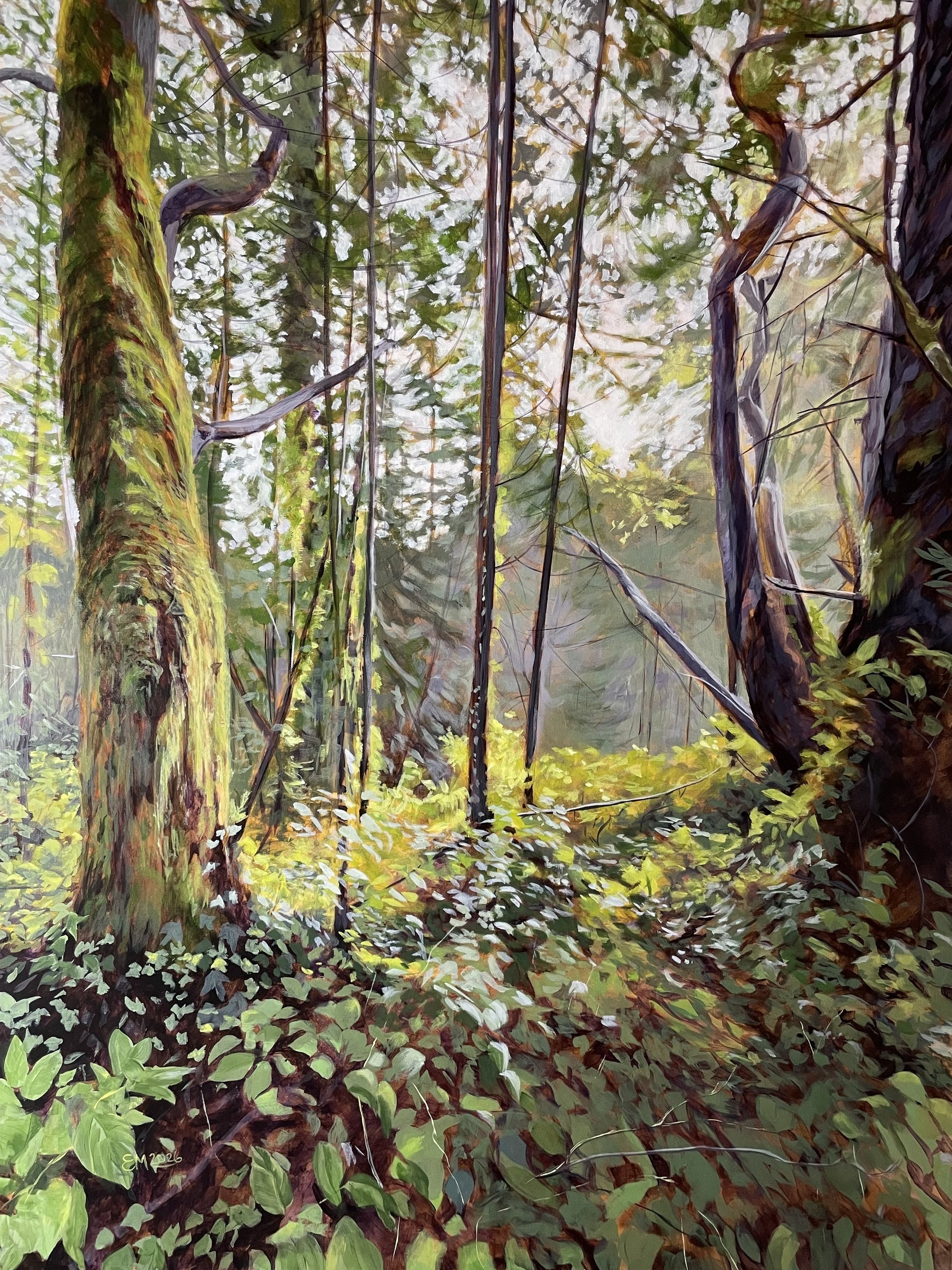 This painting holds that layered meaning. The luminous clearing ahead shows the openness and expansion, hinting at the river beyond. The shaded foreground honors rest and rootedness. Regeneration happens quietly, often beneath a canopy. It happens in community. It happens when we support one another's growth.